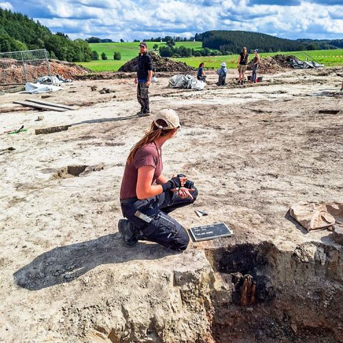 Zusammen konnte die Mannschaft die Fläche in zügigem Tempo weiter ausgraben und die Pfosten bergen, die in der Woche zuvor bereits entdeckt wurden. Besonders gefreut haben wir uns wieder über den Besuch von Dr. Marcus Reuter.