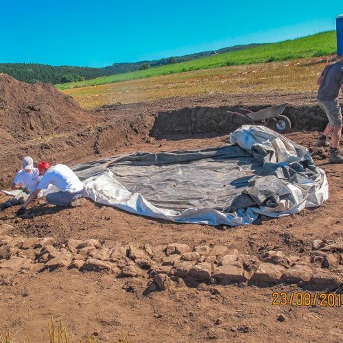 Entsprechend dem Thema "Römische Schmiede und Eisenverhüttung" wurden am Montag vergangener Woche 3 Flächen mit dem Bagger geöffnet. Im Laufe der Woche konnten so die Strukturen eines weiteren Raumes im Anschluss an das Schmiedegebäude von 2010 freigelegt werden. In der Nähe dieser Fläche ist ein kleines Gebäude, das aus einem Raum besteht, bearbeitet worden. Die dritte Fläche ist im Bereich der Eisenverhüttung.
