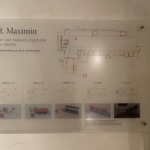 Die heutige Abteikirche Sankt Maximin geht auf einen spätantiken, von der christlichen Gemeinde genutzten Grabbau zurück. Seit der Mitte des 4. Jahrhunderts war an dieser Stelle, ausgehend von einem privaten Mausoleum, ein großer rechteckiger Komplex angelegt worden, in welchem in der Folgezeit die christliche Gemeinde ihre Toten bestattete.