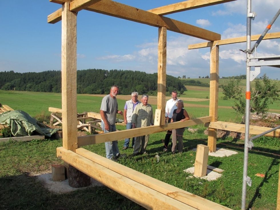Aber bis zum Vereinsjubiläum ist weiter noch viel Arbeit am Speichergebäude angesagt. Es wächst von Woche zu Woche und soll am nächsten Samstag endgültig die Giebelspitzen erhalten. Wenn in den nächsten Wochen genügend Helfer zum Infopunkt kommen, werden sicherlich bis dahin auch Dachschindeln verlegt werden.