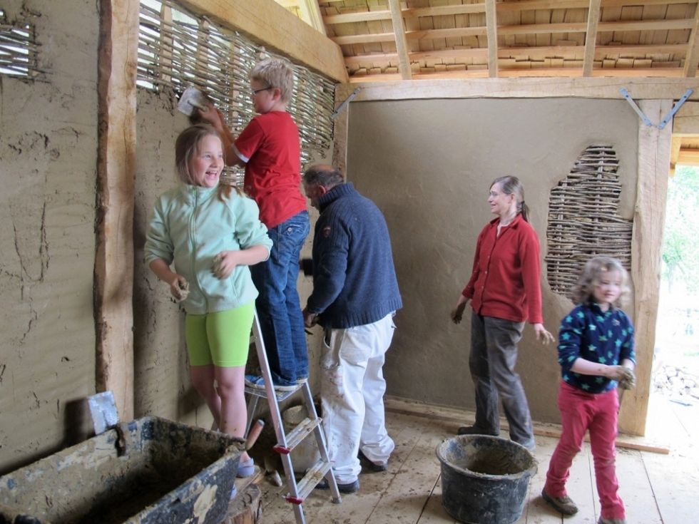 Für die Kinder war es ein besonderes Erlebnis mit den Füßen den Lehm zu stampfen um ihn für den Putz vorzubereiten und ihn auch anschließend mit den Händen aufzubringen. Ein gesunder Baustoff, der auch ohne Probleme von Kindern bearbeitet werden kann - einfach ein tolles Material.