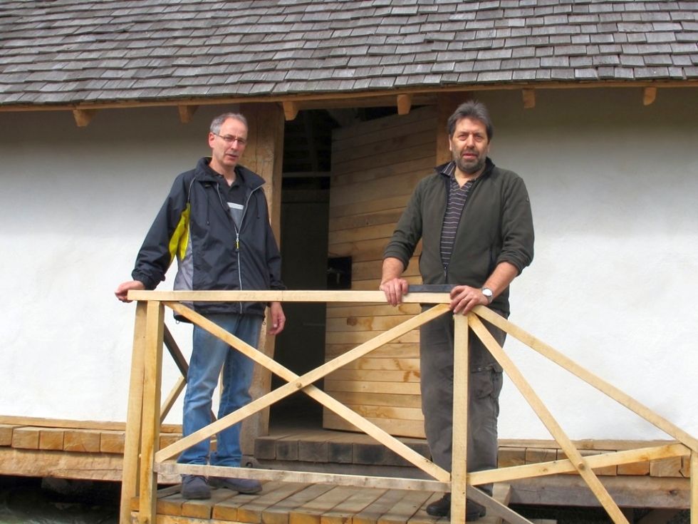 Also wieder einmal erfolgreiche Arbeitseinsätze, wobei als Krönung der Woche dann die Lieferung der Eingangstür erfolgte. Der Inhaber der Erlebnisschmiede Knauf hatte das massive Türschloss - nach Original-Vorlagen aus römischer Zeit - angefertigt. Die passende Tür dazu schreinerte Norbert Lenzen. Vier Männer waren nötig, um die Tür in das Gebäude zu transportieren, was für massive deutsch/römische Wertarbeit spricht.