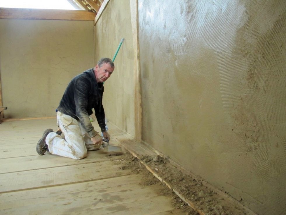 Am Vormittag konnte noch trockenen Hauptes am Lehmputz gearbeitet werden. Die Mittagspause musste dann bereits in das Speichergebäude verlegt werden. Bei den abschließenden Außenarbeiten an der dritten Lehmputzschicht kam aber auch schon der „Segen” von oben - also alle Flächen schnell wieder mit dem Wetterschutznetz abhängen. Nun können die Wände schön langsam abtrocknen, damit außen abschließend der Kalkputz als Wetterschutzschicht aufgebracht werden kann.