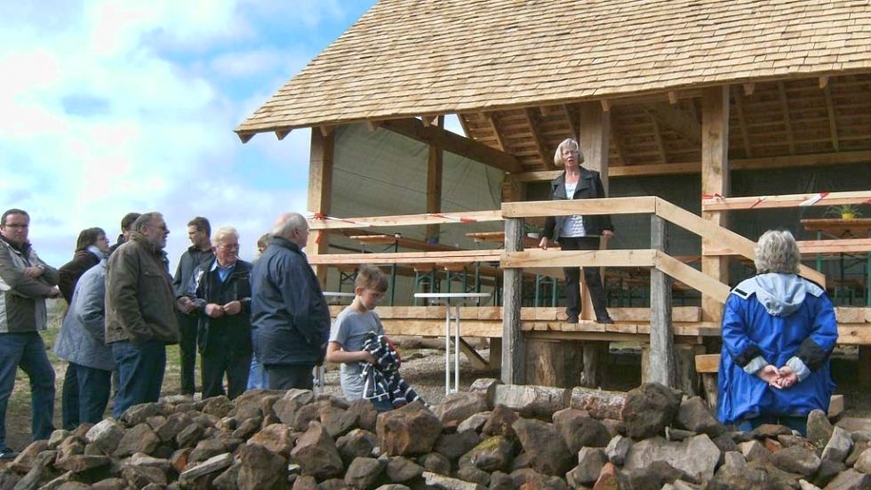 Pünktlich zum Vereinsjubiläum haben wir uns ein ganz tolles Geburtstagsgeschenk gemacht - so drückte es Landrat Heinz-Peter Thiel im Gästebuch aus: die Nachbildung des römischen Speichergebäudes (6-Pfostenbau) ist im Rohbau fertig!