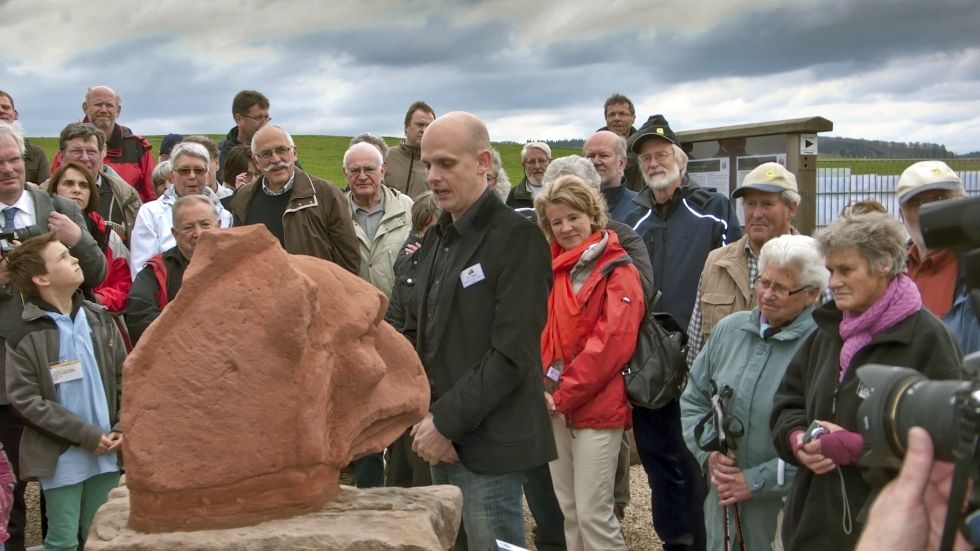Auch für den in 2013 geplanten 6-Pfostenbau sagte sie Unterstützung aus Mainz zu. Sie könne zwar noch nichts zur finanziellen Situation sagen, aber man würde in Verbindung bleiben und müsse kreativ mit der Sache umgehen. Wir sind gespannt. Ja und dann kam der spannende Moment der Enthüllung. Der mit rotem Samt kunstvoll verhüllte Greifenkopf erblickte wieder das Tageslicht - sehen Sie sich dazu die Fotos in der Galerie an.